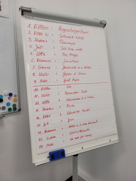 Und weil meine Teilnehmerinnen und Teilnehmer der Schreib:Zeit mit Gabi wirklich hörbare Erfolge vorweisen können, werden wir nach der erfolgreichen Premiere im letzten Jahr eine weiter Lesung auf die Beine stellen. Für die Vorbereitung der Veranstaltung habe ich in Kooperation mit Rosemarie Schmitt am 24. Juni einen Samstags-Workshop durchgeführt. Wie geht Lesung? Dieser Frage sind wir in Theorie und Praxis nachgegangen, am Ende standen fünf Autorinnen und ein Autor gut vorbereitet vor uns.