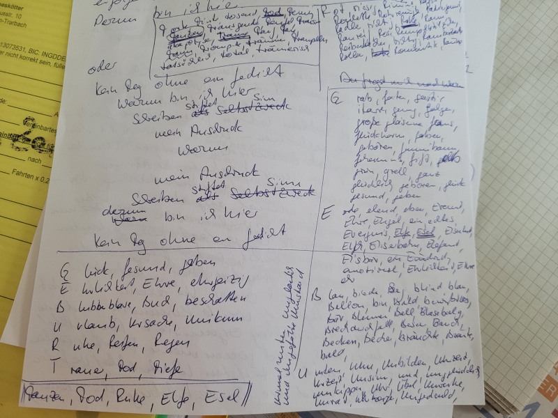 Meine Notizen des Abends zum Thema Buchstaben-Roulette zeugen von der überraschenden Wortvielfalt: sieben Schreibende und kaum Dopplungen 🙂