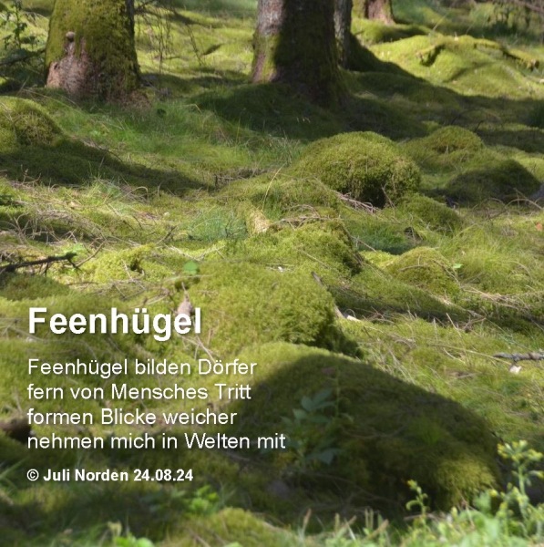 Waldboden mit weitläufigem Moosbewuchs darauf das Gedicht "Feenhügel" von Juli Norden