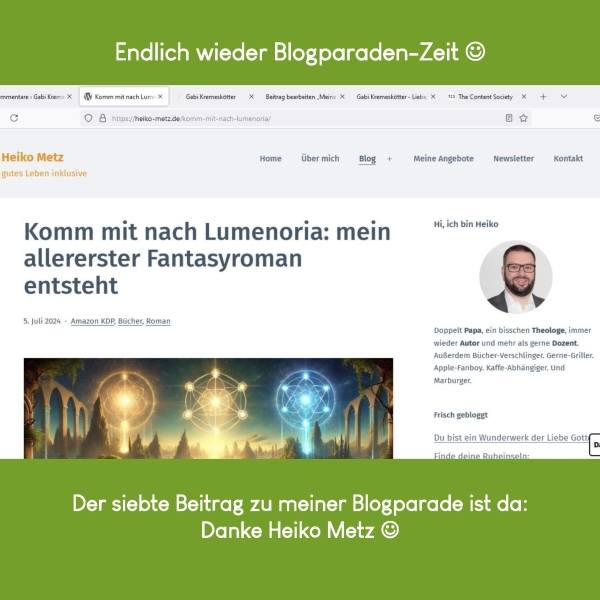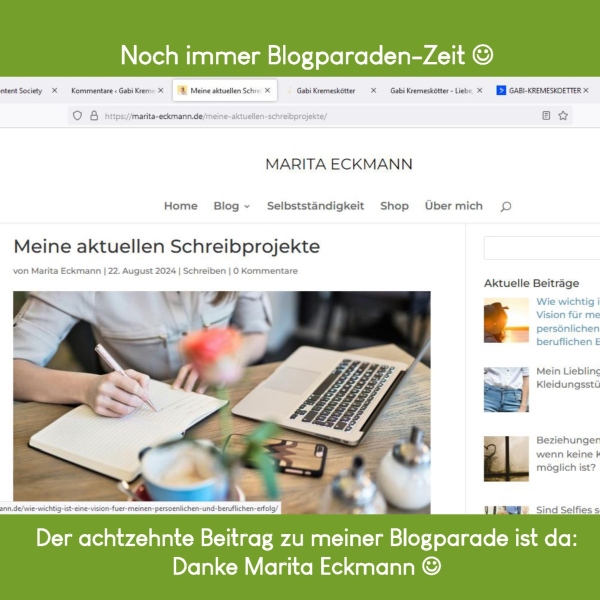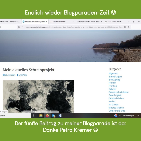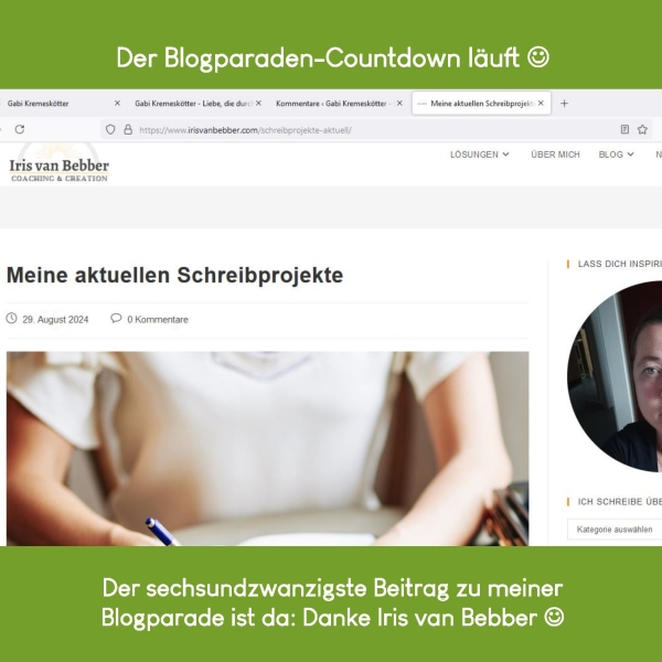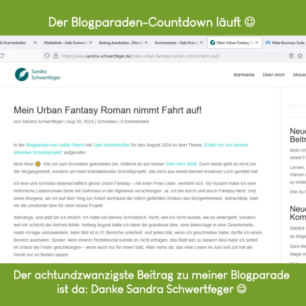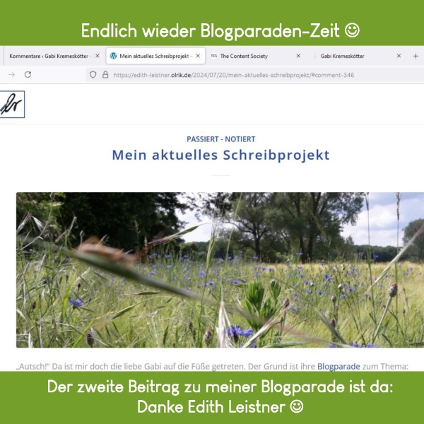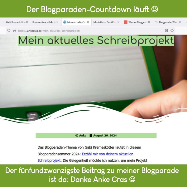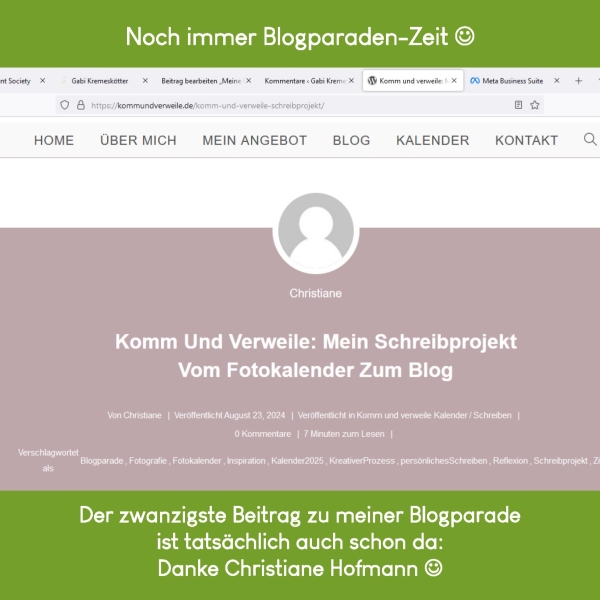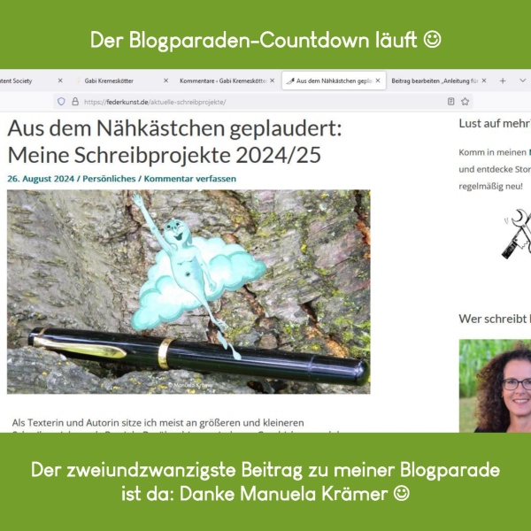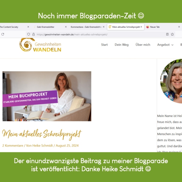 Für mich war von Anfang an klar: Ich nehme an anderen Blogparaden teil. Einmal habe ich einen bestehenden Artikel angepasst, am Ende sogar einen Beitrag für zwei thematisch für mich zusammenpassende Aufrufe gebloggt. Ich hätte noch mehr schreiben mögen, jedoch nicht können, denn auch mein Tag hat nur 24 Stunden … Der Ablauftermin 01.09.24 schob meiner Schreibzeit einen Riegel vor. Noch nie bloggte ich mehr in einem Monat als im August 2024 🙂 Der September wird sich definitiv von meiner Seite aus beruhigter zeigen …