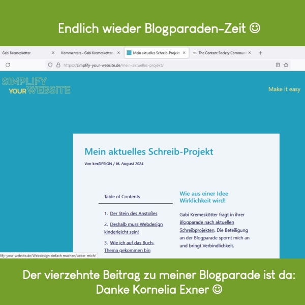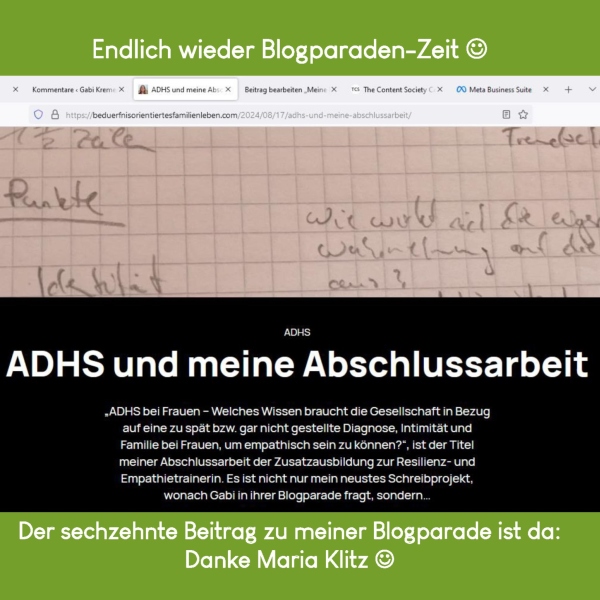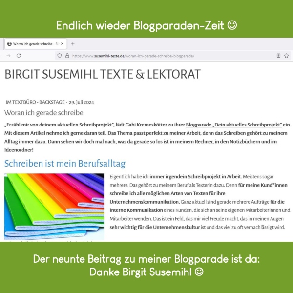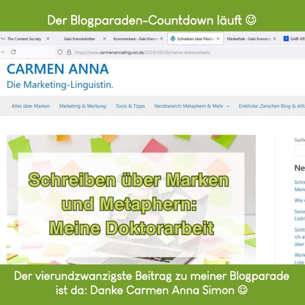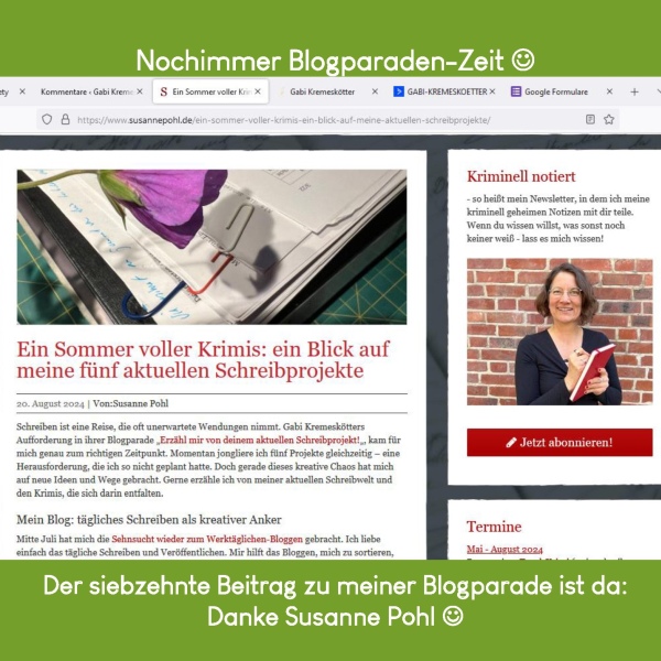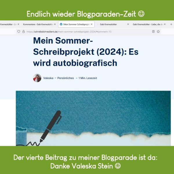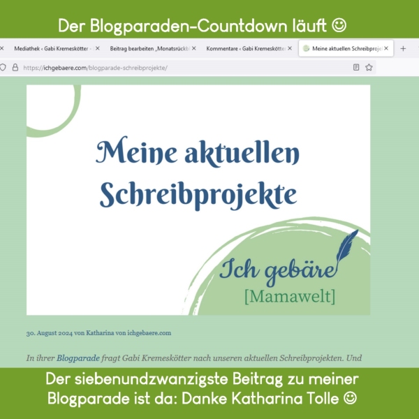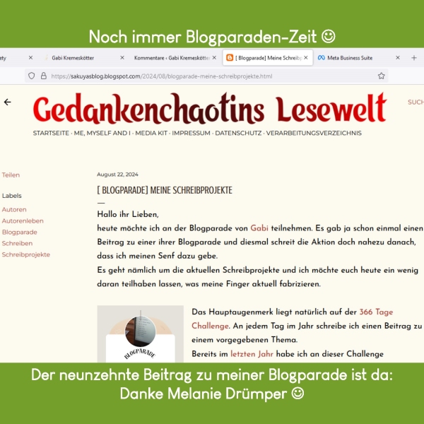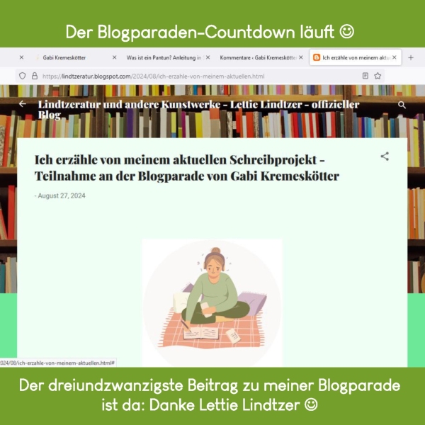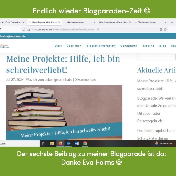 Für mich war von Anfang an klar: Ich nehme an anderen Blogparaden teil. Einmal habe ich einen bestehenden Artikel angepasst, am Ende sogar einen Beitrag für zwei thematisch für mich zusammenpassende Aufrufe gebloggt. Ich hätte noch mehr schreiben mögen, jedoch nicht können, denn auch mein Tag hat nur 24 Stunden … Der Ablauftermin 01.09.24 schob meiner Schreibzeit einen Riegel vor. Noch nie bloggte ich mehr in einem Monat als im August 2024 🙂 Der September wird sich definitiv von meiner Seite aus beruhigter zeigen …