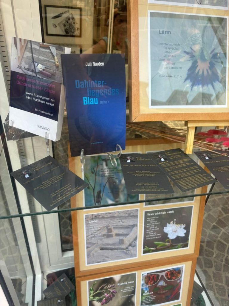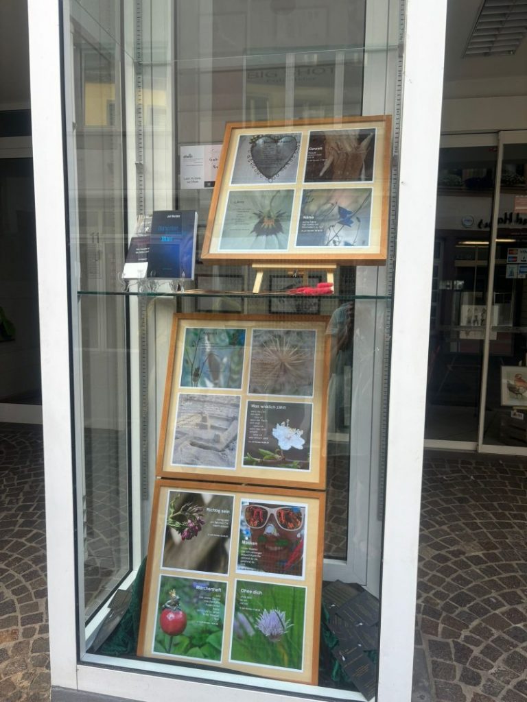 Meine liebe, gute Bekannte Ellen Helfrich ist ein umtriebiges Wesen. Und so bekam ich im August einen Monat lang bei der in Wittlich stattfindenden Kunstaktion meinen Platz in einem leerstehenden Schaufenster zur Präsentation meiner Themen und Angebote: Meine Arbeit als Freie Rednerin, meine zwei Bücher sowie eine Auswahl an Tagesgedichten. Insgesamt 12 meiner Kreationen sind noch bis Mitte September dort ausgestellt 🙂