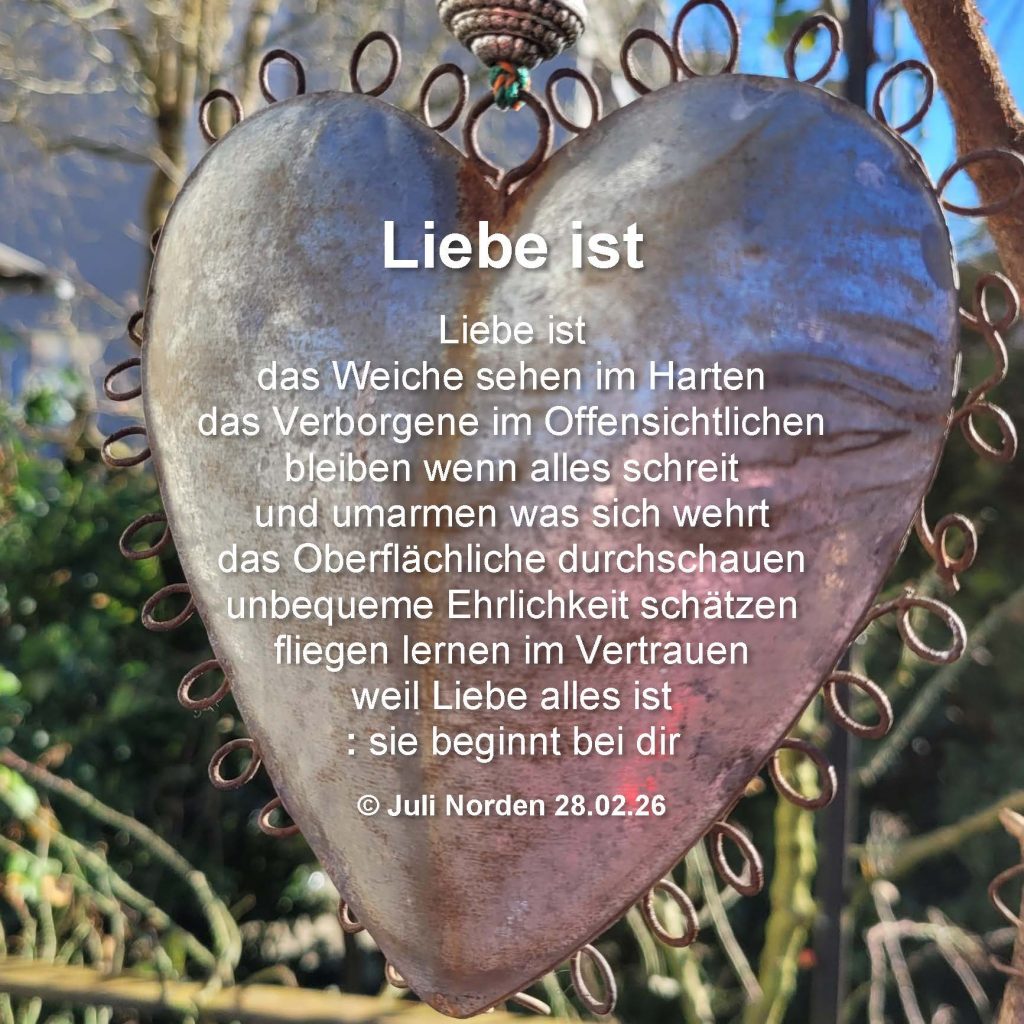 Liebe ist / das Weiche sehen im Harten / das Verborgene im Offensichtlichen / bleiben wenn alles schreit / und umarmen was sich wehrt / das Oberflächliche durchschauen / unbequeme Ehrlichkeit schätzen / fliegen lernen im Vertrauen / weil Liebe alles ist / : sie beginnt bei dir / (c) Juli Norden 28.02.26
