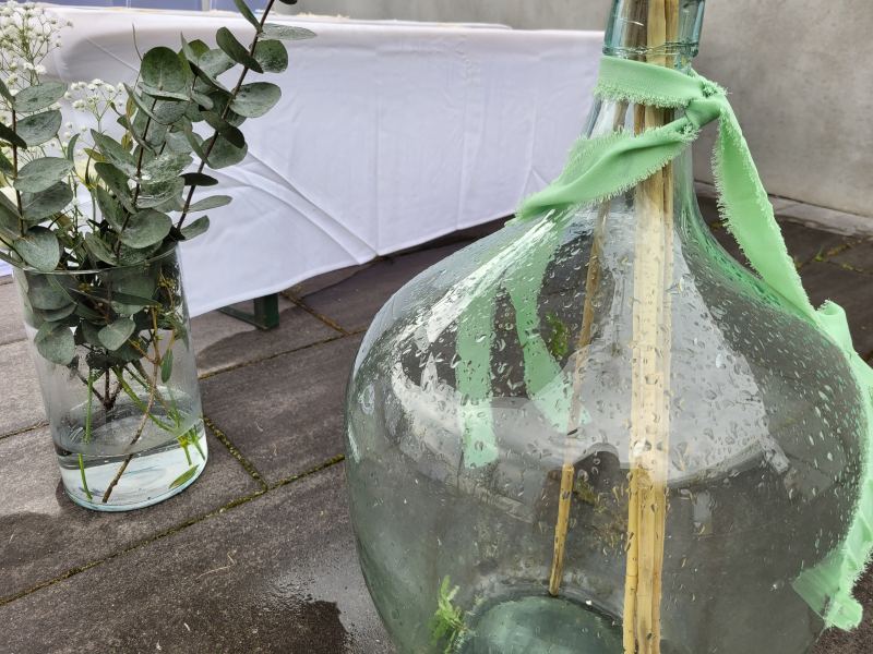 Humorvoll getragen, wird meine Beschallung neu ausgerichtet und bevor der Regen einsetzt, kürze ich meine Rede spontan, jedoch nicht weniger gefühlvoll. Als ich den Beiden ihr JA-WORT abgenommen habe, bleibt sogar noch Zeit für eine Überraschung von Seiten der Gäste. Die fröhliche Runde genießt die Abkühlung durch den Gewitterregen unter dem Vordach und auch mein Equipment findet Platz unter einem großen Sonnenschirm.