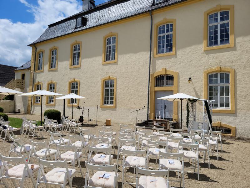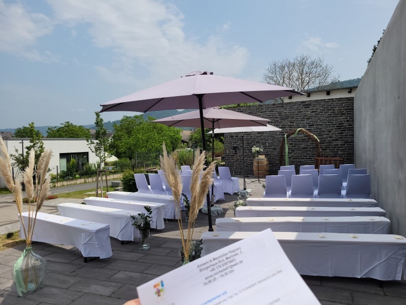 Ein kleiner Ort an der Mosel, Dorfgemeinschaftshaus: Eine Lokation, die von innen betrachtet, in nichts zurückstehen muss, verglichen mit anderen. Liebevoll von der Braut und ihren Helferinnen dekoriert und gestaltet, dazu angenehm beschattet. Bei hochsommerlichen Temperaturen von 30+ ein echter Vorteil! Die Schwüle der Luft, Gewitter im Anzug, dazu ein einkrachendes Bein meines Verstärker-Stativs, machen die freie Trauung von Annemi & Max auch für mich zu einer bleibenden Erinnerung 🙂