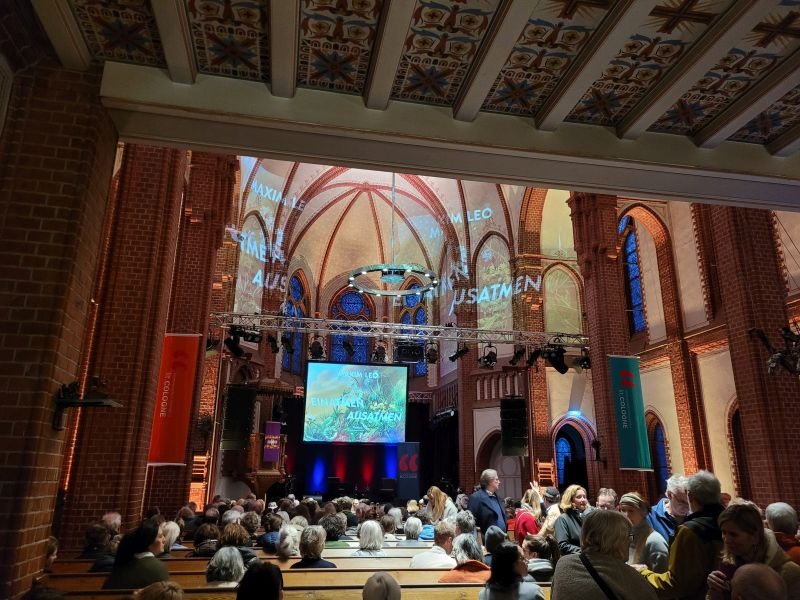 Am 14. März löste ich mein zweites Ticket ein und erlebte den Friedenspreisträger Navid Kermani auf der Bühne in der Kulturkirche Köln-Nippes. Ein sympatischer Mann, eine sehr komplexe Fragen stellende Literaturwissenschaftlerin und -kritikerin Wiebke Poromka ließen die 90 Minuten Interview und Lesung wie im Flug vergehen. Ein prägenden Satz sagte der Autor im Rahmen der Veranstaltung, den ich festhalten möchte: