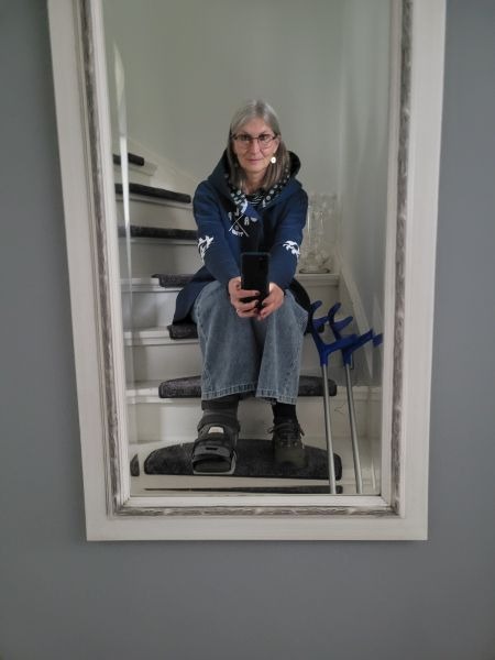 Tja, was soll ich sagen außer „dumm gelaufen“, besser Treppenabwärts unaufmerksam? Wobei ich meinem rechten Knie die Verantwortung übertragen möchte, denn es konnte meinen Körper auf der letzten Stufe nicht richtig halten und zack, bin ich mit dem linken Fuß auf dem Boden zu heftig aufgekommen. Fuß umgeknickt, Mittelfußknochen des kleinen Zeh-Strangs gebrochen. So kann es gehen, wenn frau nicht mehr gut gehen kann. Voll doof!