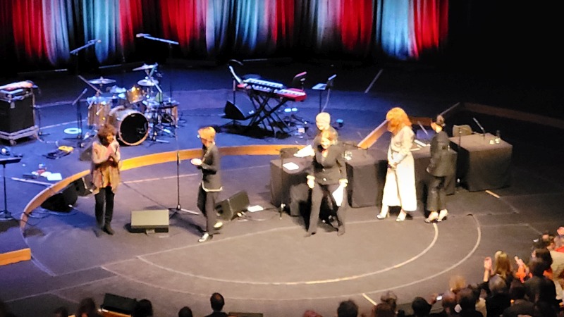 Hoch oben im Publikumsrund in Reihe 29 hatten meine Kinder, ein guter Bekannter und ich einen wirklich guten Überblick. Die Akustik tat ihres dazu, dass wir klar und deutlich alle Texte verstanden. Mariele Millowitsch, Marleen Lohse, Désirée Nosbusch und Claudia Roth machten einen guten Job. Bettina Böttinger moderierte den Abend mit weiteren Zitaten und Witz, ließ guten Nachrichten auch schlechte folgen. Frauenunterdrückung, Frauenerfolge, Frauennöte und Frauenerrungenschaften. Mit Ernsthaftigkeit aber auch Heiterkeit nahm die Folge der Texte das Publikum mit und die Songs der Sängerin samt Band (sie nannte sie „ihre Jungs“) passten sehr gut in die Dramaturgie des Abends.