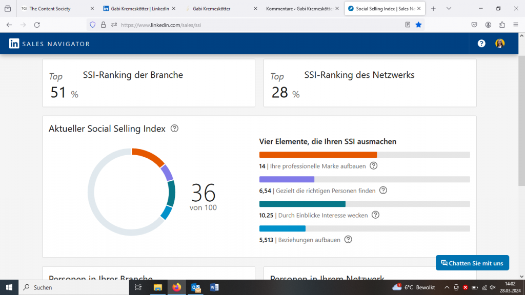 Habe am 24.3. meinen ersten eigenen Beitrag veröffentlicht und ja: ich werde dran bleiben! Die Plattform scheint für meine Belange jedenfalls deutlich wertvoller zu sein als Facebook und Instagram. Denn statt wahllos rumzuscrollen, finde ich hier subtantiellen und inhaltlich wertvollen Kontakt. Mein Social Selling Index sitzt zwar noch im Keller, aber umso leichter fällt mir dann mein Aufstieg 🙂
