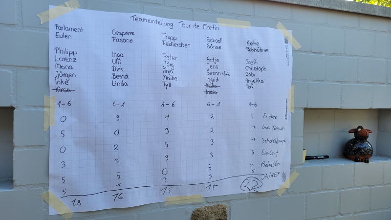 Im Mai luden meine Schwester und ihr Mann zu einer Fahrradrallye ein, die von ihren zwei Kindern als Gemeinschaftsgeburtstagsgeschenk ausgeheckt wurde. Insgesamt fünf Gruppen waren bei der Tour de Martin unterwegs, ich war Teil der „Kette Rebhühner“. Insgesamt waren das wahre Erwachsenenfragen und Aufgaben, die wir zu lösen hatten.