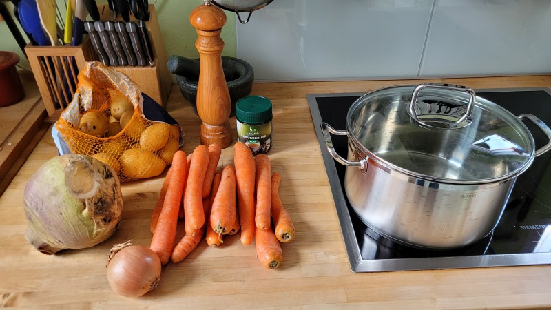 - eine Steckrübe, Gewicht: so viel, wie sie eben wiegt. Meine bringt für dieses Mal knapp 1,1 kg auf die Waage (ungeschält).