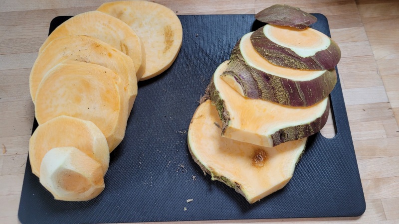 - Währenddessen die Steckrübe in gleichmässige, ca. 1 cm dicke Scheiben schneiden, dabei den Strunk und die Spitze abschneiden.