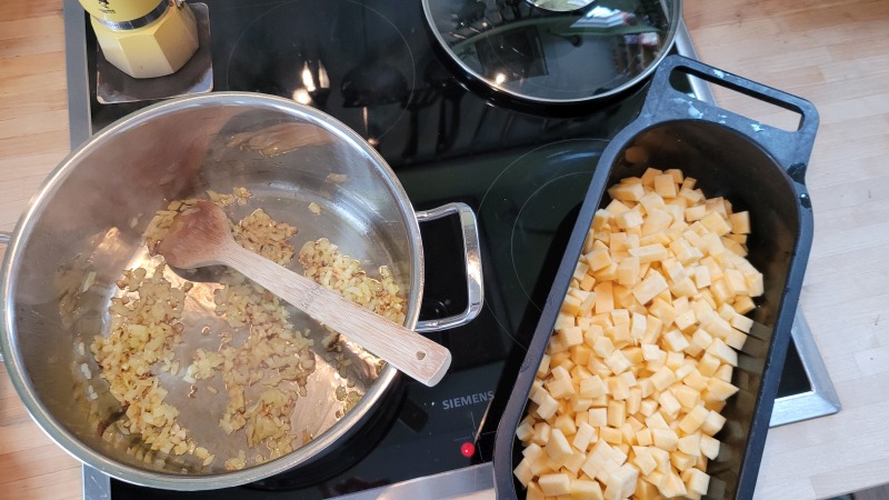 - Die Steckrübenwürfel zu den gerösteten Zwiebeln geben und anbraten, auch sie dürfen ruhig leicht anrösten. Ab und zu umrühren, ich mache das bei Stufe 7 bei einer Skala von 1-9.
