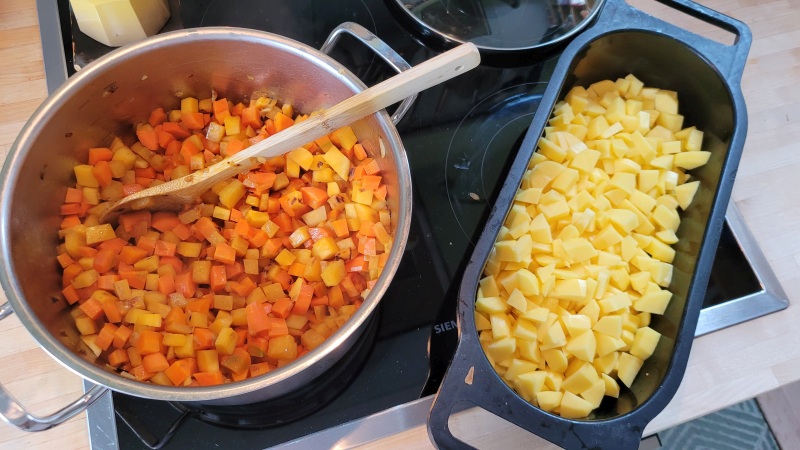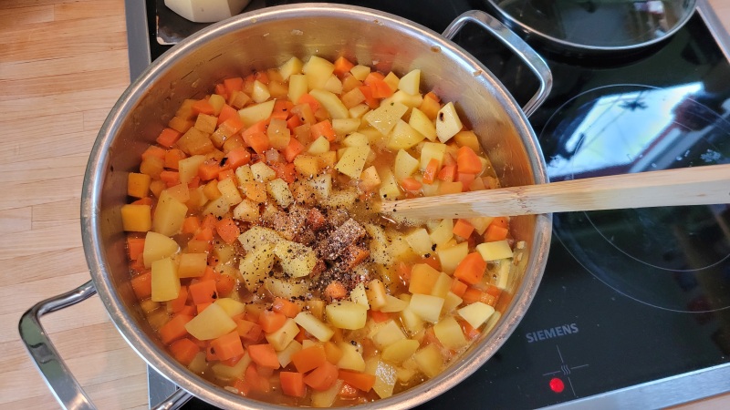 - Die Kartoffeln schälen und ebenfalls würfeln. Wenn Karotten und Steckrüben etwas vorgegart sind, die Karoffelwürfel zugeben. Alles gut umrühren und noch etwa 10 Minuten weiter anbraten, aber aufpassen, dass nichts anbrennt. Also immer gut umrühren und die Hitze reduzieren auf Stufe 4 bei einer Skala von 1-9.