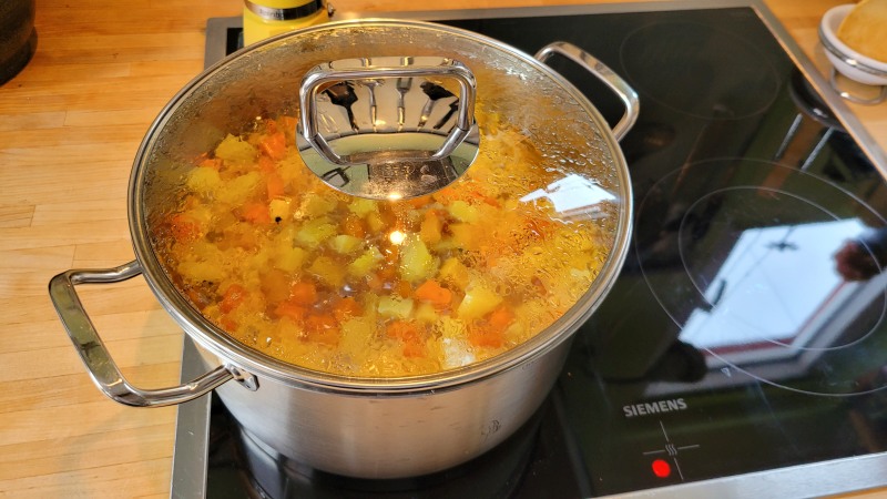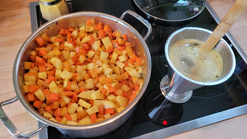 - Mit der Gemüsebrühe das Kochgemüse ablöschen, dabei am Boden des Topfes eventuell leicht angesetzte Reste lösen. Mehrmals rühren und dann den Deckel drauf. Die Temperatur weiter runterregeln, sobald alles gut durchköchelt. Ab jetzt nutze ich nur noch Stufe 1 (von 9).