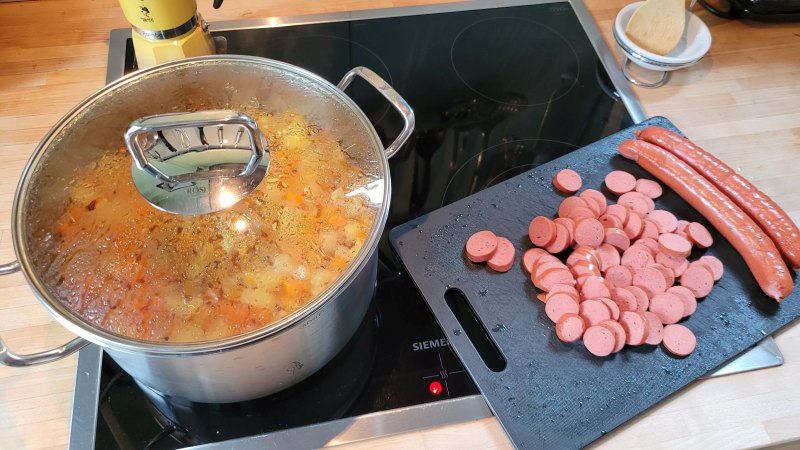 - Nach gut 2 Stunden schneide ich die Rindswürste (oder wer mag: Mettenden) in schmale Scheiben und lasse sie noch gut 15 Minuten mitköcheln.
