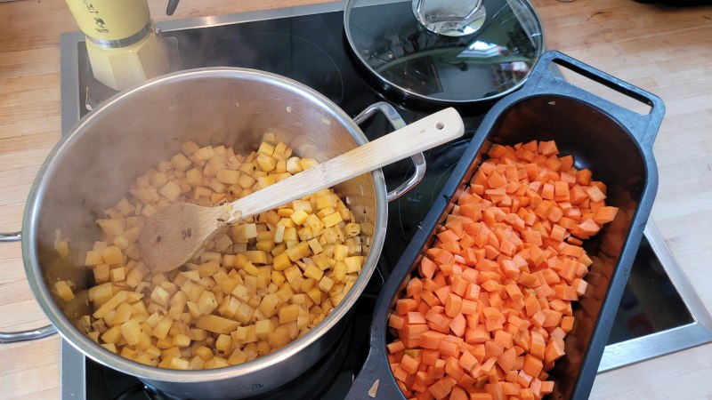 - Während die Würfel garen, die Karotten schälen und ebenfalls würfeln und zu den Steckrübenwürfeln geben, mitgaren. Nun die Hitze runterstellen auf Stufe 6 bei einer Skala von 1-9, um anbrennen zu vermeiden.