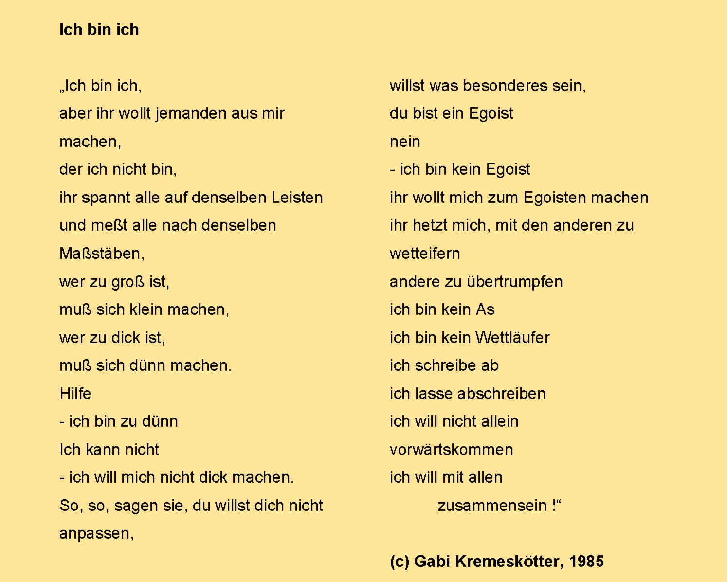 Mein erstes Gedicht veröffentlichte ich tatsächlich in der Abiturzeitung 1985. Rückblickend wundere ich mich über meinen Mut, diesen Text dafür eingereicht und an alle meine Mitschüler:innen verteilt zu haben: