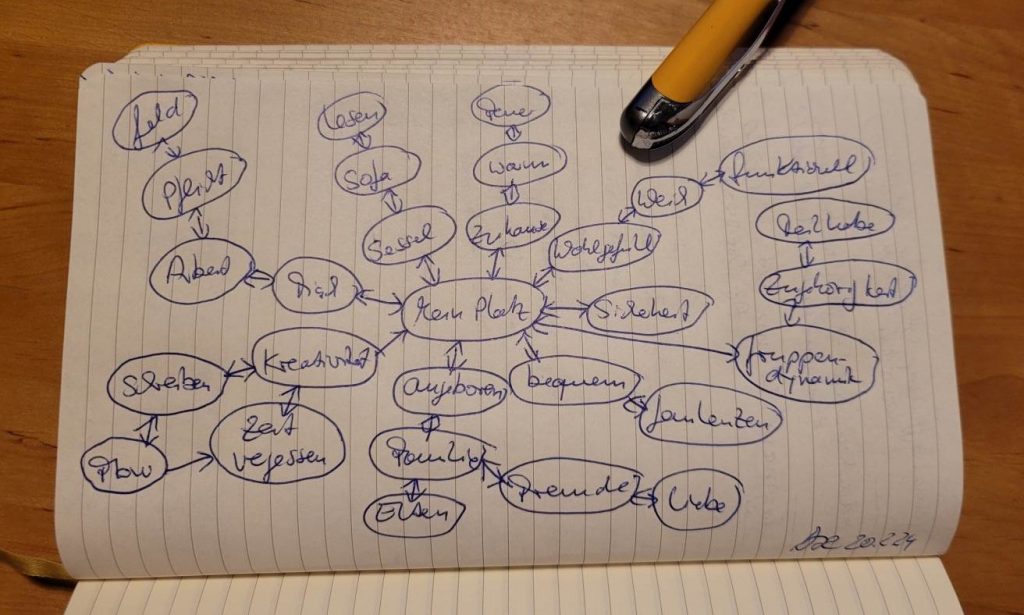 Vom Ursprungsbegriff ausgehend finden sich so immer mehr Assoziationen. Du hast einen Gedanken hier, einen Gedanken dort, der wiederum mit etwas Neuem in Verbindung geht. Du schreibst spontan alles auf, was dir in den Kopf kommt und verknüpfst auch untereinander oder neu.