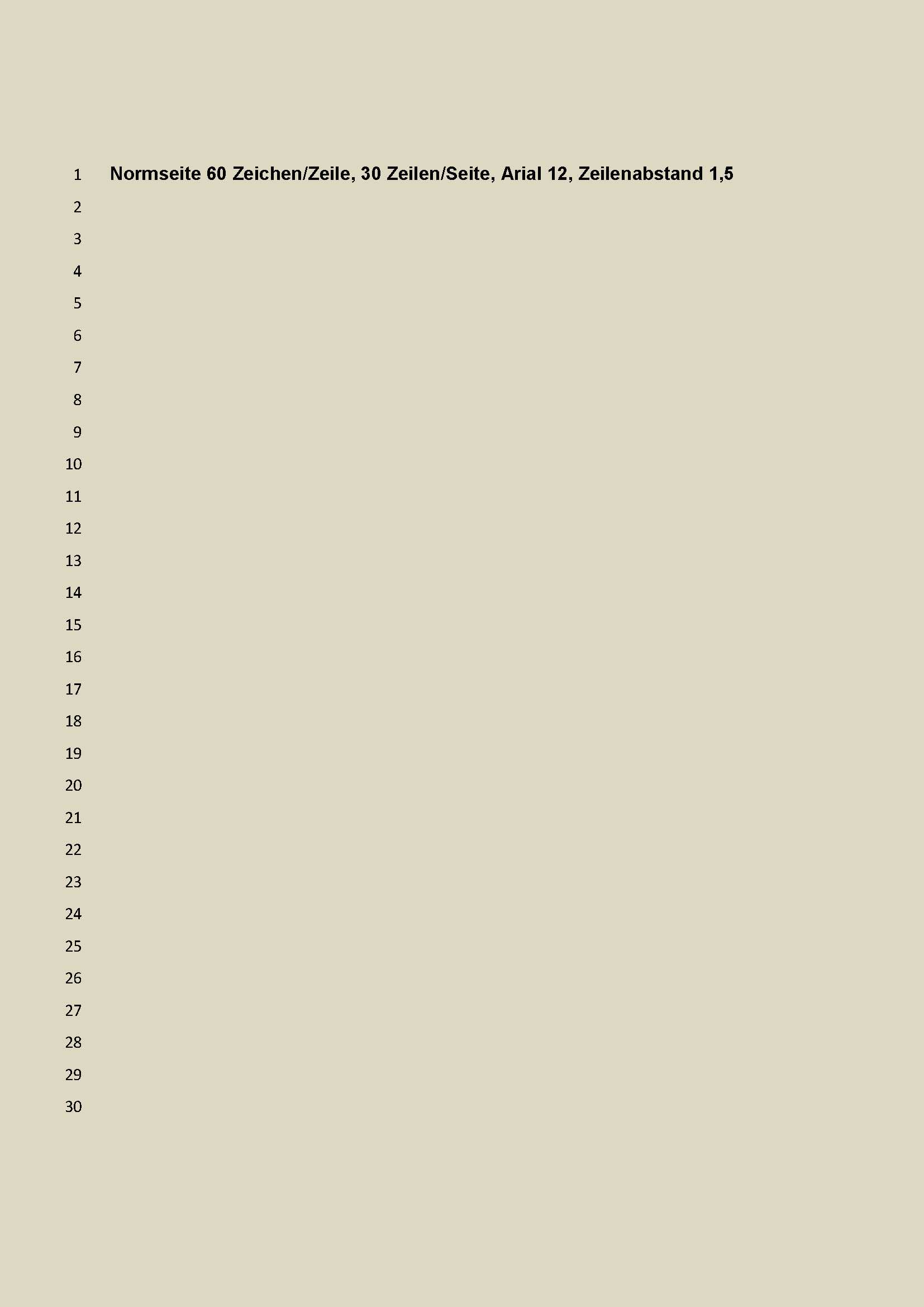 Die meisten Textverarbeitungsprogramme zeigen beim Öffnen einer neuen Datei ein bestimmtes Format. Die Standardeinstellungen können sehr unterschiedlich sein. Daher ist wichtig zu wissen, dass die Formatierung einer Normseite den Standardeinstellungen in der Regel nicht entspricht. Sie muss manuell in der eigenen Schreibsoftware eingestellt werden.