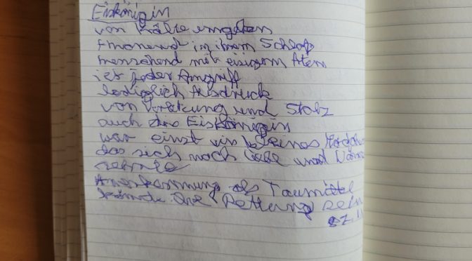 Darum schrieb ich nicht. Und das war echter Entzug für mich. Ich las ganz viel, doch untersagte mir das Darüber-Nachdenken. Denn meine Gedanken dazu aufschreiben war für mich nicht realisierbar. Hatte mich mental lange auf die Wochen „danach“ eingestellt, mit allem würde ich klarkommen, aber nicht schreiben können: davor grauste mir. Gedanken nicht festhalten können als schnelle Zettelnotiz oder Eintrag in meiner Kladde: diese Vorstellung lähmte mich, aufgezwungene Schreibblockade der anderen Art 🙂